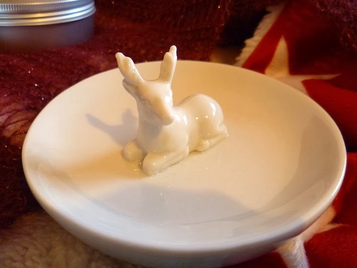 Suivie d'une coupelle en céramique blanche avec un cerf adorable en son milieu. Je suis sûre qu'il surveillera à merveille quelques bijoux ou autres petites futilités.